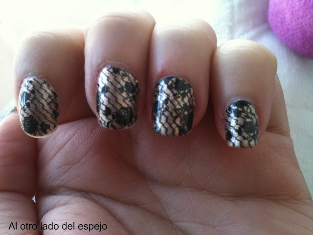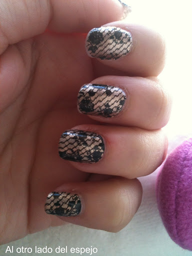 Y bien, en las fotos ya podeis ver el resultado. Fue sencillo de poner, de hecho simplemente hay que tantear un poco el tamaño de la pegatina y pegarla en nuestra uña intentando que sobre en los lados y en la punta de la uña, no en la zona de la cuticula, y os aseguro que es muy sencillo hacer eso. Luego lo que sobra simplemente es doblarlo debajo de nuestra uña, y como quien dice, se corta sola. Porque al hacer este movimiento el borde de la uña corta la pegatina.