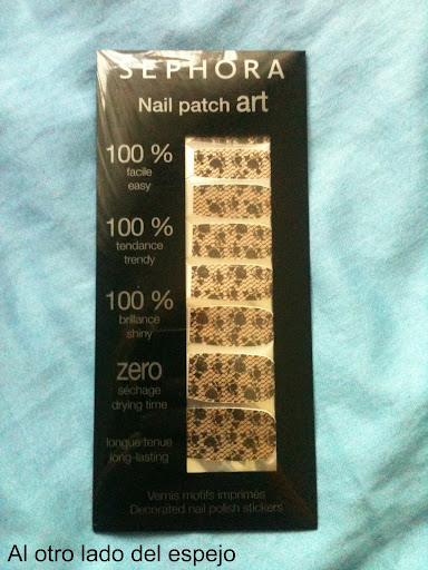 Asi que como leia tantas opiniones positivas de las pegatinas de Sephora, mi fortaleza empezo a tambalearse, y un día en el Sephora se las vi a una chica que las llevaba impecables. Asi que una de dos, o bien esa niña era una crack con las pegatinas, o bien el producto valia la pena. Por tanto me compre un paquetito y para que experimentara antes de cargarmelas, me dieron varias pegatinas sueltas del mismo tono para que cogiese practica.